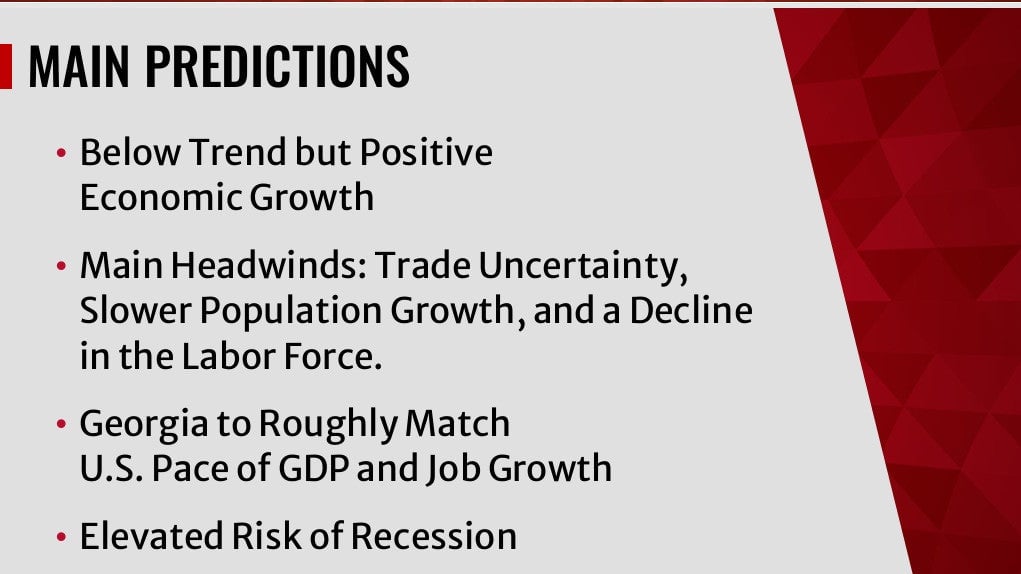 Chatterjee said based on Gross Domestic Product (GDP) and job growth, Georgia’s economy will match or exceed the U.S. economy, although at a slower pace than in the past. He attributed that to uncertainty related to trade policies and tariffs, a decline in the size of the labor force, and slower population growth.