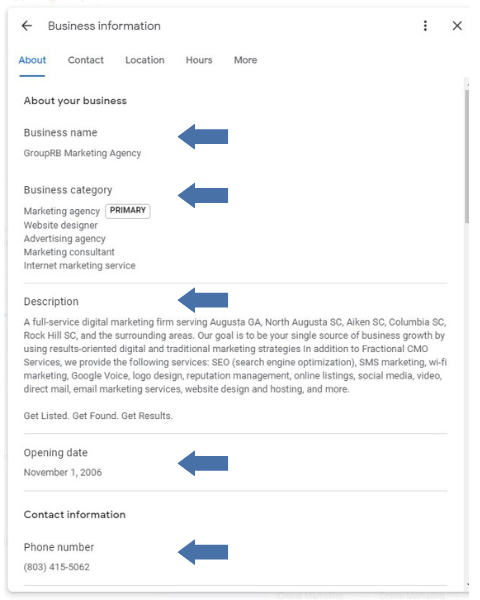 The business information section for your business profile comprises 5 sections: About, Contact, Location, Hours, and More. We should complete each section.