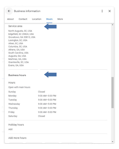 Next, you will enter the service area, hours, and holiday hours.