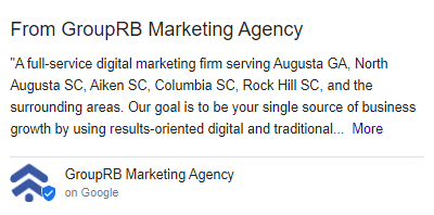Now you can select relevant categories that reflect what your business does and that is in sync with what your website says you do. Your primary business category will appear on your listing, so choose wisely. GroupRB selected “marketing agency” as you can see below.