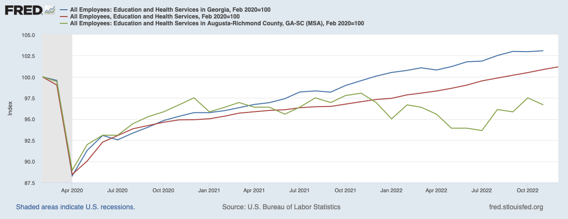 The biggest concern I see in the data is a decline in employment in the education and health services sector by 350. This sector is still 1,400 jobs below the pre-pandemic peak. The graph below shows regional and national comparisons for this sector (data has been adjusted to an index number for easy comparison). Since the beginning of the pandemic recession, employment in health and educational services nationally has increased by 1.2 percent and 3.1 percent in Georgia. Atlanta has seen employment increase by over 5.7 percent. Augusta, on the other hand, has employment in health and educational services 4 percent below pre-pandemic levels.