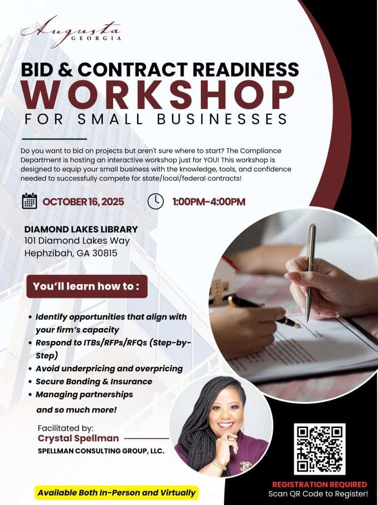 A bid and contract readiness workshop will be held at the Diamond Lakes Library in Hephzibah. It is a collaboration between the City of Augusta Compliance Office and Spellman Consulting Group, LLC.