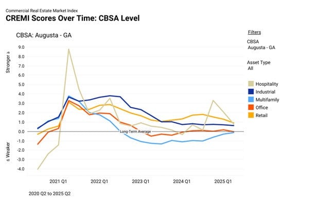 Nationally, the CREMI is -0.74 and has been negative since early 2023 suggesting that Augusta is doing well compared to itself historically, but also compared to other metro areas across the country today.
