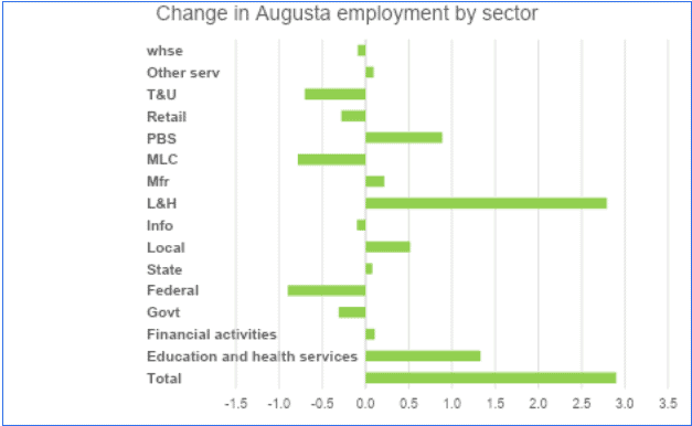 The overall strength of the local labor market stands in contrast to the slow pace seen nationally. Employment growth nationally was the slowest for two decades outside the great recession and the covid recession. In Augusta, employment growth in 2025 was stronger than in 2024 and 2023. The local growth in education and health services and leisure and hospitality exceeded the growth in those sectors nationally. However, utilities employment increased nationally while it declined locally.