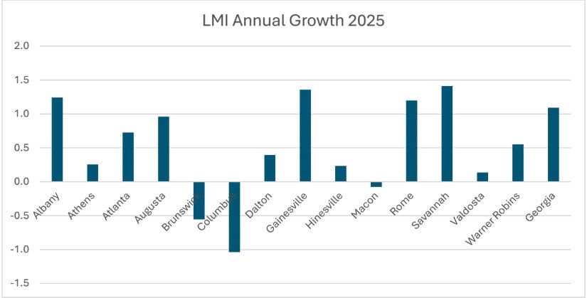 Putting all this data into the Augusta Labor Market Index (LMI), we find the labor market improved one percent last year, slightly slower than the state average, due to the rising unemployment rate. Savannah and Gainesville grew the fastest, while the labor markets of Brunswick, Columbus, and Macon deteriorated.