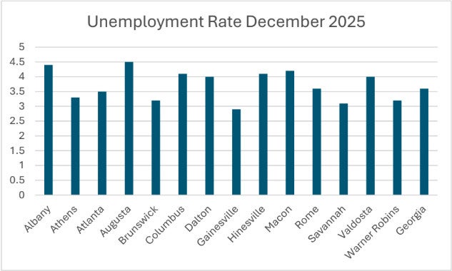 The last bit of economic data for 2025 was just released for the Augusta Metropolitan Statistical Area (MSA). The unemployment rate has risen from 4.1% in September to 4.5% in December. This is the highest unemployment rate across the fourteen Georgia MSAs.