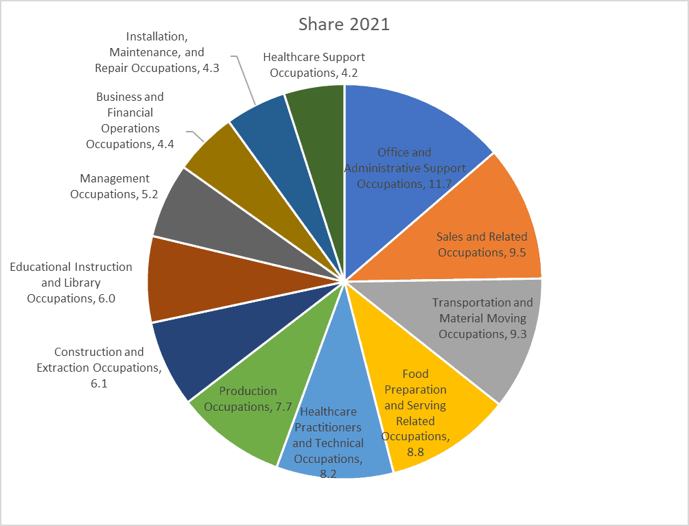 There are several things of interest. First, the top 12 major occupational groups remain the same in 10 years’ time as today. Second, office and administrative support occupations and sales and related occupations saw their share of the economy fall. In fact, these occupations have been losing share since 2013 and will have fewer jobs in 2031 than in 2013 even as the economy grows.