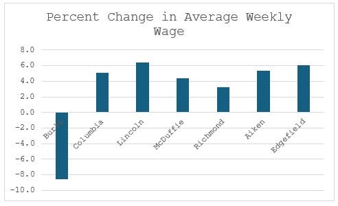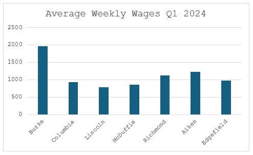 The good news for Burke County is they still have the highest average weekly wage at $1,972, comfortably higher than second place in Aiken County. Although Lincoln County had the fastest growth, it is from a low base. Average Weekly wages in Lincoln County are the lowest of the MSA at $782.