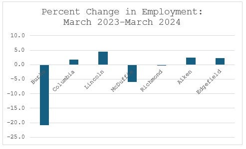 Burke County also saw employment fall by 20 percent between March 2023 and March 2024. McDuffie County and Richmond County also saw employment fall by 5.9 percent and 0.2 percent, respectively. Richmond County remains the economic driving force of the MSA employment of over 100,000. Aiken County trails in second place with about 65,000. Lincoln County saw the largest growth in employment of 4.5 percent, but again from a low base: employment in Lincoln County is just 1,451 in March 2024.
