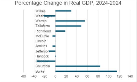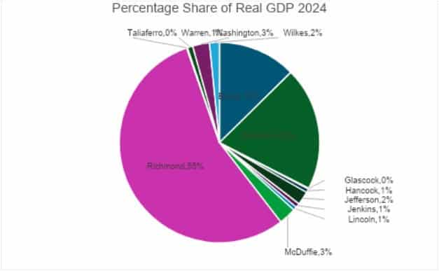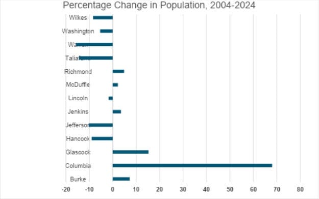 When looking at Gross Domestic Product (GDP), or the final value of goods and services produced in a county, Burke County doubled its output due to the expansion of Plant Vogtle. Eight counties have grown economically over the last two decades, but five have gotten smaller. In 2024, just three counties (Richmond, Columbia, and Burke) accounted for 83% of the CSRA’s GDP.