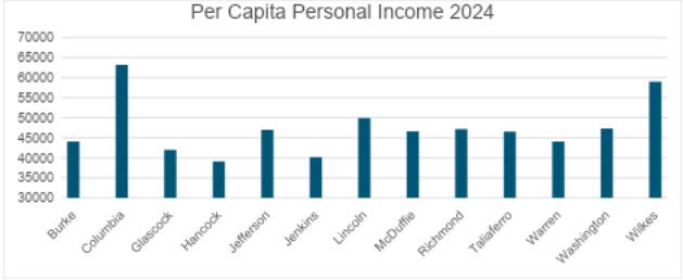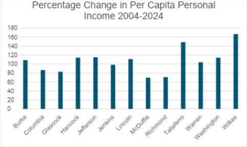 Per capita personal income has doubled over the last two decades in eight, mainly rural, counties. The largest increases were seen in Taliaferro and Wilkes counties. Those counties have the second-highest per capita personal income behind Columbia County.