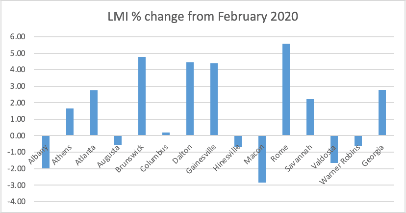 Looking at the broader labor market index (LMI) which also includes unemployment, labor force, earnings, and hours worked, there are six MSAs, including Augusta, that are below pre-Covid levels. The data indicate that post-COVID growth has occurred in two clusters, around Atlanta in the northwest of the state (including Athens, Dalton, Gainesville, and Rome) and in the southeast around the two port cities of Savannah and Brunswick.