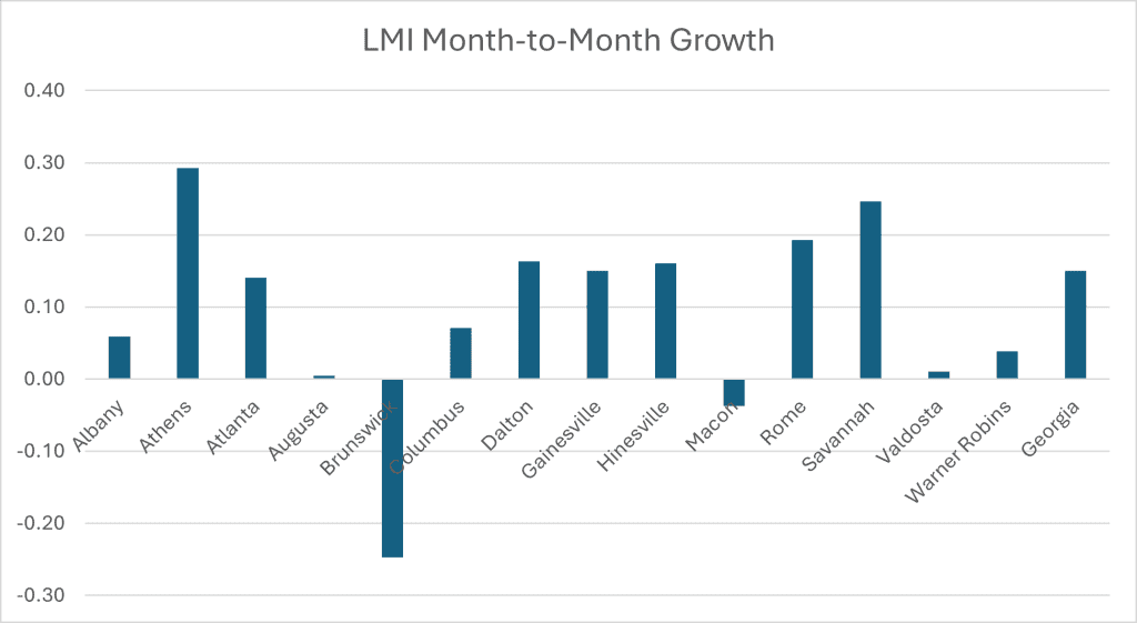 Across the Metropolitan Statistical Areas (MSAs) of Georgia, only Brunswick and Macon saw declines in the LMI. Athens, Dalton, Rome, and Savannah saw above-average growth in their LMIs. Across the MSAs, employment was down in eight and up in five. Unemployment fell or remained the same in all fourteen MSAs. Eight MSAs saw their labor force expand, and six contracted. Earnings and hours increased in nine MSAs and fell in five.