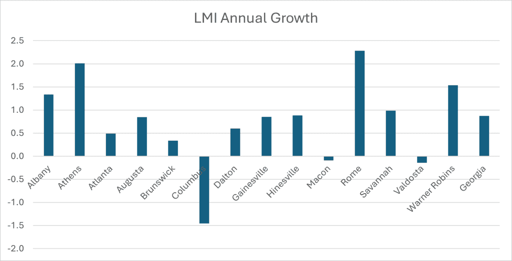Labor markets in Columbus, Macon, and Valdosta have deteriorated from a year ago, while Albany, Athens, Savannah, and Warner Robins have improved more than the state average. Overall, Georgia’s labor markets are stronger than a year ago and marginally better than in July.