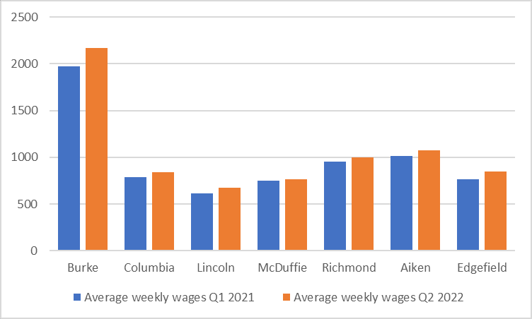 In terms of growth of wages over the last year, Burke, Lincoln, and Edgefield have recorded increases of about 10 percent, enough to compensate for inflation. Wage growth in Columbia, Richmond, and Aiken counties was about 5 percent and McDuffie County only recorded a 2 percent increase from the first quarter of 2021.