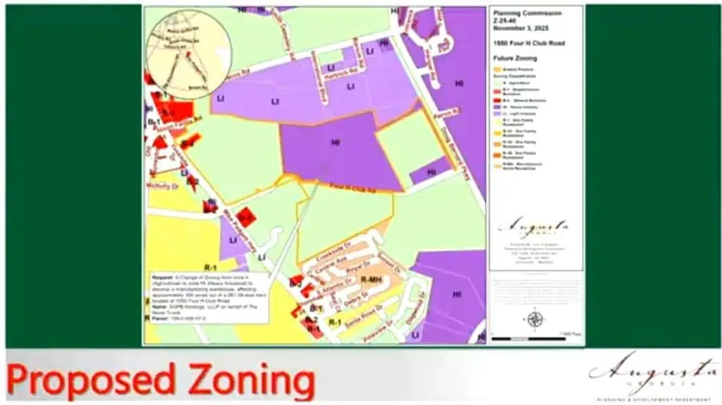 Ashley Catterton, development service administrator with Augusta Planning, noted that nearby tracts have already been rezoned from A to Light Industrial (LI). The rezoning clears the way to build the warehouse in the vicinity of Augusta Regional Airport.